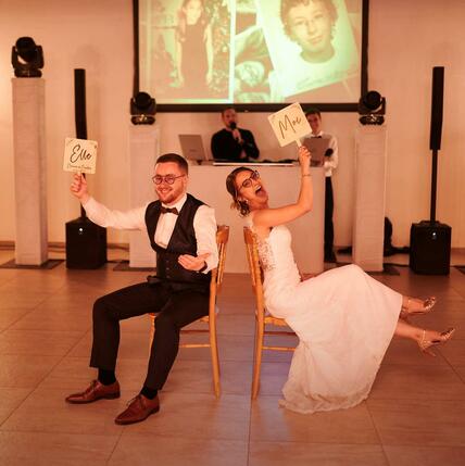 En général, l’idéal est une animation entre chaque plat, où les mariés sont les acteurs principaux (jeu du Lui / Elle, 12 mois), des animations à base de tests musicaux ou des quizz sur des thèmes choisis par les mariés.